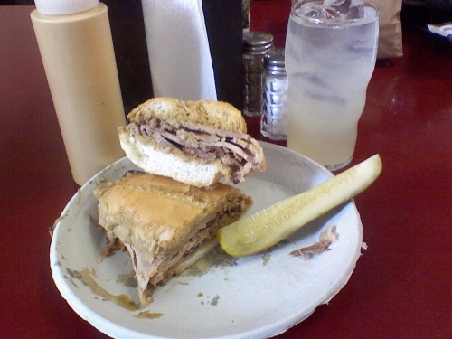 Phillipe’s is a Los Angeles institution, and the sandwich that they present is one of simple perfection. It is roast meat dipped in juice and served on a french roll. Cheese is available but is not a standard part of the sandwich and mustard is provided at each table but obviously is also optional. Phillipe’s is one of two places laying claim to inventing the French Dip sandwich and you could not ask for a better example of the type. The meat is hot, tender and flavorful, roasted until it sings. It comes dipped in hot drippings and if one so desires the sandwich can be “twice dipped” for maximum effect. Though I have heard tale of sandwiches so juicy that they had to be eaten over a bowl it was my experience that the french roll held together just until it was devoured. The mustard provided is heavy on the horseradish but I found it to be a wonderful compliment to the sandwich.