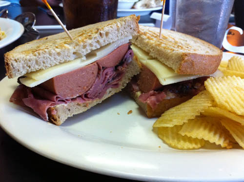 The Sailor is the most complex simple sandwich I’ve encountered in some time. It consists of pastrami, knockwurst, Swiss cheese, and “bistro sauce” (Russian dressing, as you’d expect) on rye bread. It’s a very interesting spin on a traditional deli sandwich, and I was more than rewarded for spying it on the menu. The ingredients meshed better than I could have hoped. I’m finding more and more that, although pastrami is a fine meat in and of itself, it is the perfect complementary or supporting meat in a two-meat (or more) sandwich. It is to sandwiches what vodka is to mixed drinks: versatile, unobtrusive, and reliable. If you are in Norfolk and in need of a tasty and satisfying sandwich, I cannot recommend The Sailor enough.
