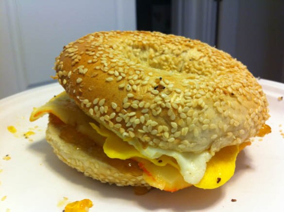 This time using a sesame seed bagel, I again fried two eggs and added a slice of cheese, but instead of butter or margarine, I went with apricot preserves. Although messy (due to the hole in the bagel), the combination of jam and egg is always welcome, and paired better with the sesame seed bagel than it would have with the “everything” bagel. I feel I made the correct choice with both bagel sandwiches. The only thing I would do differently next time is giving the eggs a liberal dose of pepper. If you find yourself with a bagel, a couple of eggs, and five minutes, you would certainly be doing yourself a favor if you whip up a quick and satisfying sandwich.