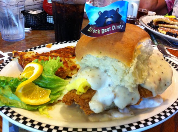 Getting past semantics for a moment, let us discuss this creation. Black Bear Diner is a chain of kitschy diners, mostly located in smaller towns throughout Northern and Central California, and their claim to fame is an extensive menu of extremely generous portions at a fair price. The quality of their offerings is, on average, far above your usual chain diner, so it’s a great place for an individual on a budget. The “chicken-fried chicken” breakfast sandwich is a fried chicken filet, scrambled eggs, and gravy served on a biscuit. The biscuits at Black Bear Diner are generally the size of softballs, and not the first thing you would think would make an ideal delivery method for a fried chicken sandwich.