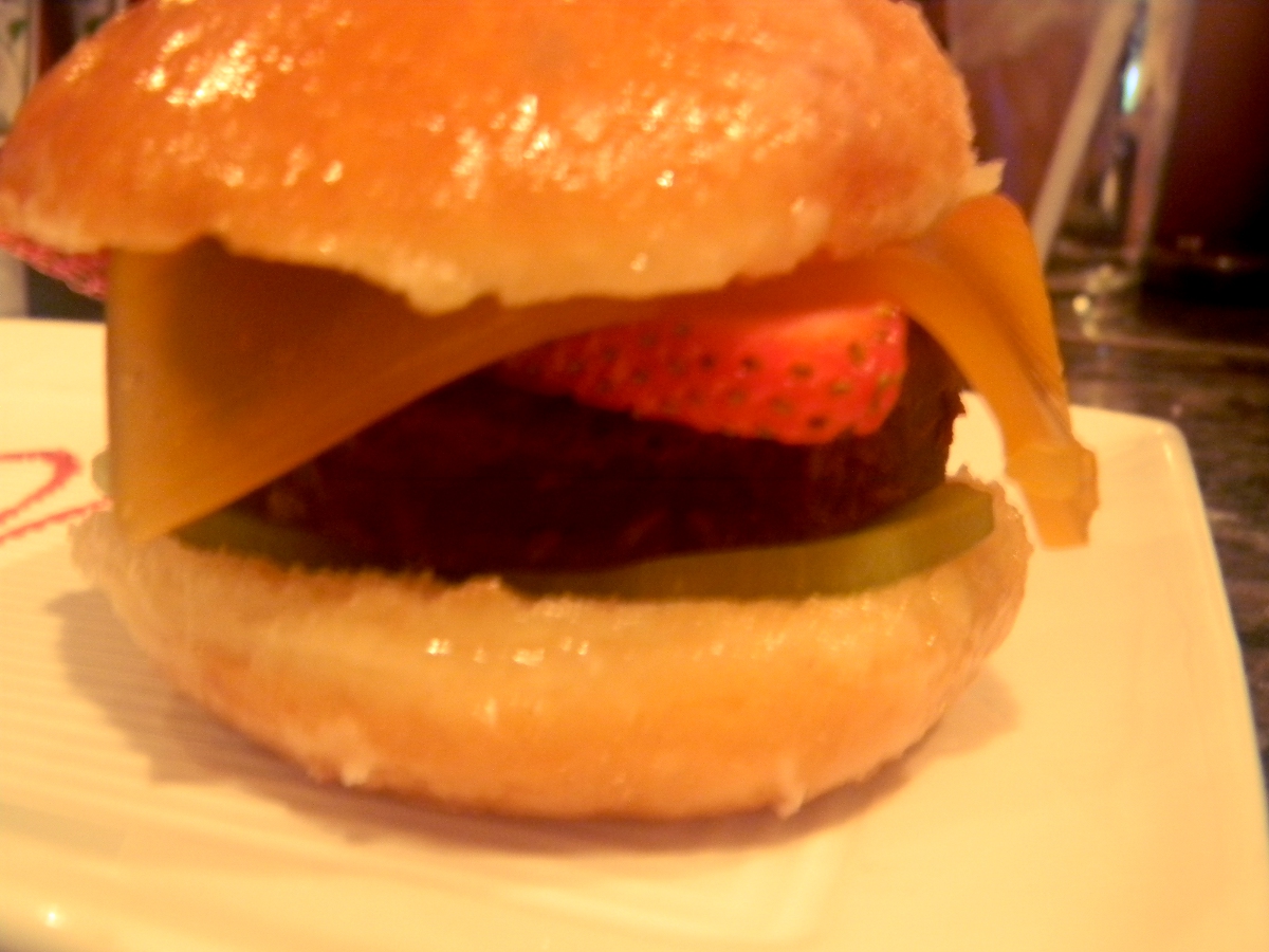 The sixty dollar Rossini at Burger Bar comes with a few perks, beyond the thrill of finding out whether it was worth your money and the story you get to tell. Specifically, it comes with your choice of a milkshake or something from the dessert portion of the menu. Though a number of the gourmet milkshakes looked delicious, one of the dessert offerings was the dessert burger and I couldn’t pass up another sandwich. I wasn’t quite sure what to expect, and when it arrived I was a bit tickled. A glazed donut is cut in two and a patty of chocolate fudge is added. There are a few slices of kiwi standing in for the lettuce, strawberry for the tomato, and a small square of gelatin does duty as the cheese. Raspberry coulis offers a ketchup garnish. I picked it up and dug in.