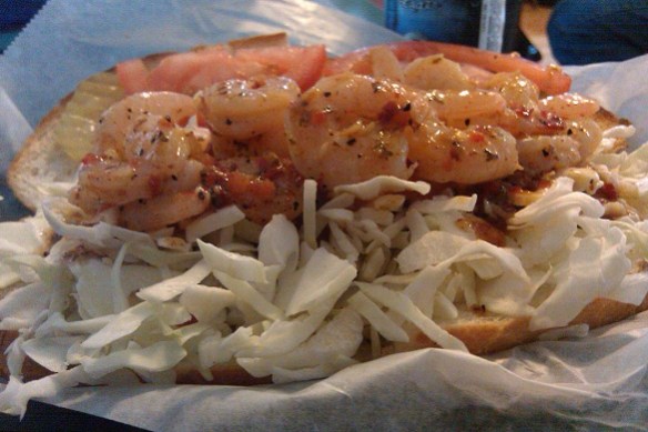 San Jose’s Poor House Bistro was previously featured here, and today’s post doesn’t have a lot to add beyond the description of two more sandwiches. Not all sandwiches need be philosophical questions, I suppose. The sandwich featured above is the BBQ Shrimp Po’ Boy, which is billed as New Orleans sauteed shrimp in a “spicy” and tangy sauce. I’m not sure why “spicy” is in quotes, but sometimes descriptions of sandwiches can be a bit screwy. In this case, what the description really needed was “peppery,” as that’s the best way to describe the sauce. I prefer my BBQ smokey and a little bit sweet, with the heat playing in the background. That’s not what I found in this sandwich, as vinegar and hot pepper took the foreground. Some folks may find this to be exactly what they’re looking for, but it just wasn’t for me.