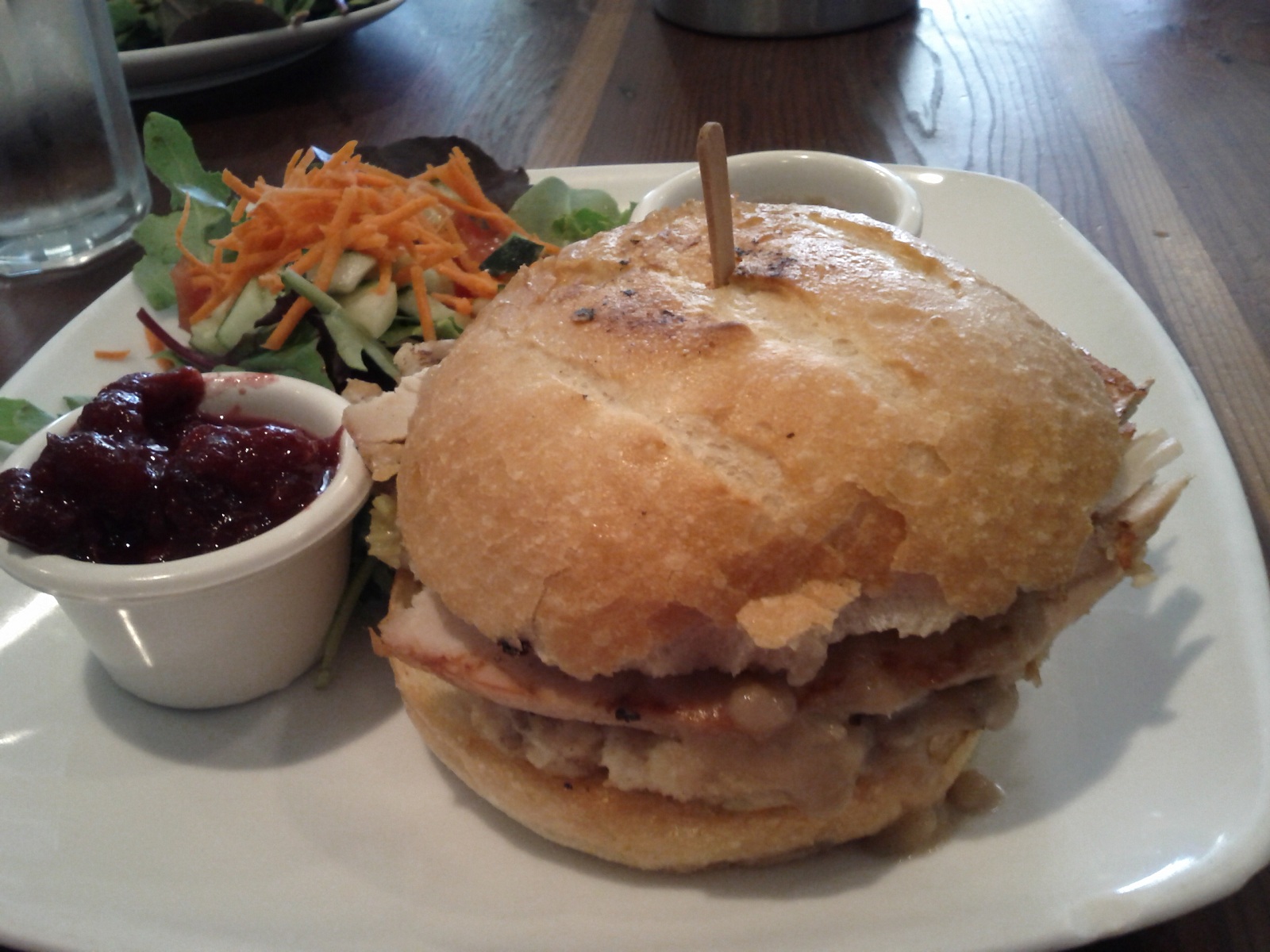 In this case, we have the classic thanksgiving sandwich, previously seen here. The root of the form, of course, is thanksgiving leftovers. Roast turkey, stuffing, gravy, and cranberry sauce seem to be the standard requirements, and that seems to be a fine base, as I don’t know if I’ve ever consumed a thanksgiving sandwich that didn’t leave me satisfied. It is the rare sort of sandwich that has both a very high ceiling and a fairly high floor; it can certainly excel but the average example isn’t so bad.