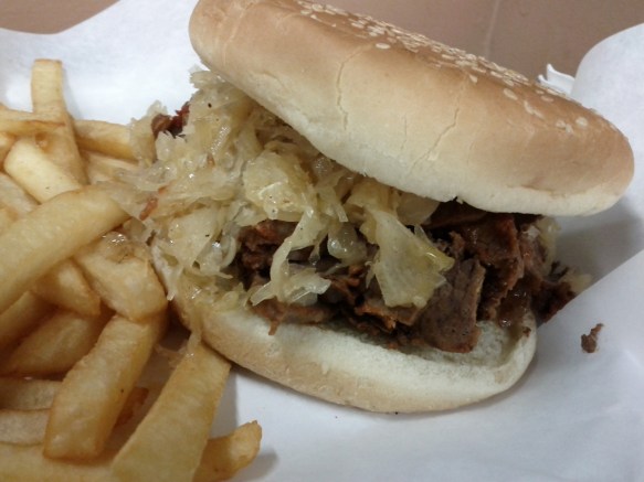 The sandwich itself is the same sesame-seed roll that holds all the burgers, piled reasonably high with slices of brisket and sauerkraut. I think sauerkraut is an underutilized sandwich ingredient, and it was a welcome addition here. The brisket was tender but a touch dry, but it had a good flavor with a touch of spice and a touch of tomato. All together, though, I don’t think I would hail it as sensational, and that raises the question of how much to hold menu copy against a sandwich. Looking to a menu board for an unbiased recommendation is a fool’s errand, I suppose, but lord knows I’ve taken less reputable advice in search of a great sandwich.