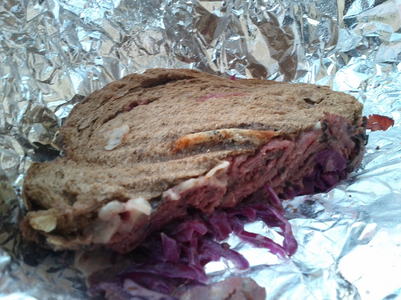 I tend to come at sandwiches from something of a traditionalist perspective. The standing archetypes of the world of sandwiches are what they are for a reason, and if you’re going to play around with them you should have a very good reason for doing so. The reuben is a good example, as it seems particularly prone to “takes” and “re-imaginings” and “total nonsense.” Picture, if you will, a standard reuben with a healthy dose of avocado along for the ride. The above sandwich is a far cry from such ghastly examples, and it is to Vine Street Deli’s credit that it is so. Their Red Baron is hot pastrami and red cabbage sauerkraut on pumpernickel, with the standard swiss cheese and Russian dressing. There are two reasons this sandwich works: The first is that they didn’t push it too far. The ingredients are straight 1-to-1 swaps with standard reuben ingredients, and not particularly imaginative ones at that. One might criticize them for sticking so close to the tried-and-true, but when the tried-and-true is so good you won’t find me among the critics. The second reason relates to what I said above, about the necessity of a good reason for futzing around with the thing in the first place. I don’t know if the hot pastrami was the driving force behind this sandwich coming together, but it more than justifies the effort. It’s peppery and immensely flavorful, walked back just enough by the cheese, dressing and slaw. The result is an exceptionally well balanced sandwich and a nice change of pace for any reuben enthusiast.