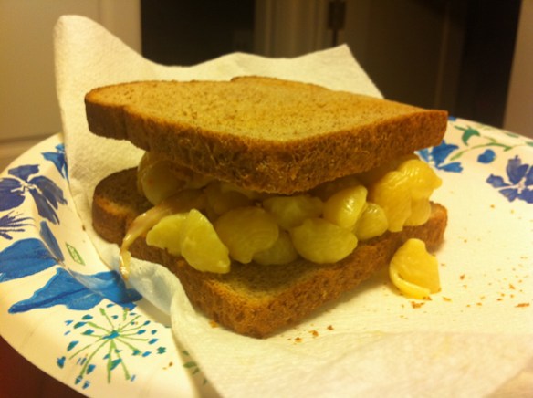 While preparing a box of “homestyle” macaroni & cheese for dinner (“homestyle” is the type that comes with a small packet of bread crumbs for sprinkling atop the finished product), I decided to make it a slightly heartier meal by shredding a quantity of deli turkey into the mixture. As I prepared to spoon the finished product onto my plate, I realized this might actuality be an opportunity for sandwich making.
