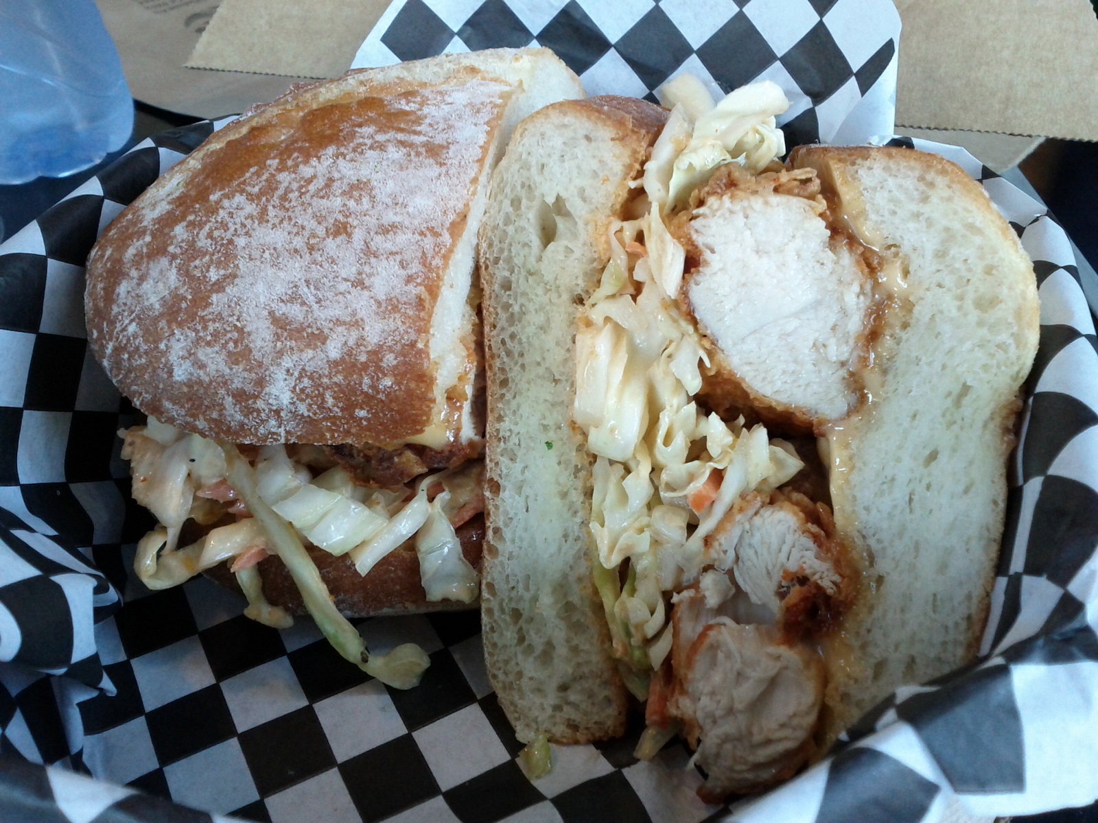 Just because running around eating my favorite sandwiches wasn’t the best way to pay tribute to San Jose before I take my leave doesn’t mean I didn’t do it. I dearly wish Little Chef Counter had been around before my last year in this city, because they’re doing really wonderful things with sandwiches. My last experience there was disappointing, but every one before and since has been anything but. The chicken salad sandwich is the latest example of their excellent offerings: big chunks of chicken join Shashito peppers, romaine lettuce, peach jam, and a few slices of bacon on a hearty roll. There’s nothing too fancy going on here, just a very good sandwich. The bacon (as is so often the case) wasn’t strictly necessary, but it didn’t detract from things. The sweet flavor of the peach jam was the dominant note in the sandwich, and the chicken itself was very lightly dressed, everything I could have asked for. I’m sure there are fine sandwiches to be found in my new city, but I can guarantee you that on some warm afternoon I will find myself wondering what new sandwich Little Chef Counter has cooked up, and wishing that I were there to eat it.