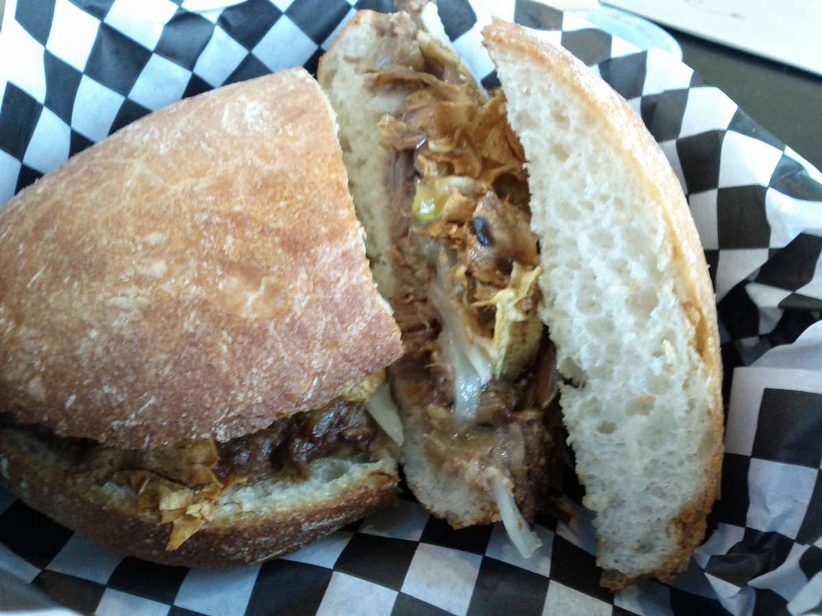 The Fernando doesn’t disappoint either. A toasted ciabatta roll held tinga de pollo, coleslaw, avocado and something they claim to be a secret sauce, but whatever it is it’s lost behind the smokey adobo flavor of the tinga de pollo. There’s spice here, but not too much of it, the coleslaw has a fresh snap, the avocado is as wonderful as avocados are, and the chicken was moist and flavorful. I don’t know that there’s much of anything you could do to make this a better sandwich, and that’s a rare feat. It’s balanced, complete, and tasty as all get-out.