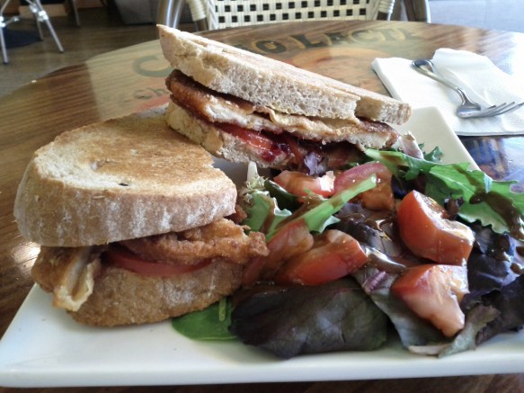 Perhaps I’m guilty here of the soft bigotry of low expectations, but much of my pleasure with this sandwich stems from the fact that it could have been much worse. It could have been a soggy patty and soggier bread, a sorry sandwich carelessly tossed out by a place more concerned with cakes and other confectioneries. But it wasn’t. It was tasty enough. I’m not certain the tomatoes needed to be there, as the sweetness from the cranberries is far superior and not burdened by the mushy texture, and I would have used some of the balsamic that went on the spring mix on the sandwich to temper the sweetness a bit. So this could have been much better, but it could have been much worse. I often rail against ‘good enough,’ but I do so in the sense of lack of effort, of an acceptance of mediocre results. But there was care taken here to avoid the worst of outcomes, and so I feel comfortable in celebrating it for what it was: a pretty good sandwich.