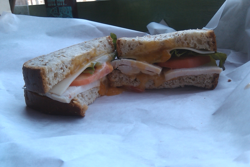 The sandwiches at Joe Davola’s all have kitschy names, the Treacherous Tarragon Chicken Salad, the Disgruntled Grilled Pork Tenderloin, the Violent Veggie “Meat” Loaf, and of course the Mad Maple Baked Turkey. It strikes me as unnecessary. When I sit down for a sandwich, I’m not looking for an adventure. I’m looking to be sated, not entertained, and “wacky” is the last adjective I’m looking to use. But I don’t let a name prejudice me against a sandwich. Serve me the Baron’s Bad-Ass Bodacious BLT, if it’s done right I’ll be happy to enjoy it. So it wasn’t the name that left me disappointed at Joe Davola’s, but the sandwich. It seems good in concept, baked turkey, apricot aioli, swiss cheese, lettuce, and tomato. But someone had a tremendously heavy hand with the apricot aioli, and the whole sandwich was lost. I’ve had tasty jam sandwiches, but never with swiss cheese and tomato. The Disgruntled Grilled Pork Tenderloin at Davola’s (with cranberry-apple compote and caramelized onions) is a fine sandwich, leading me to conclude that the one I had that day was a simple swing and a miss, rather than an indictment of the entire establishment. The Mad Maple Baked Turkey lived up to the name, but it a rather unfortunate way.