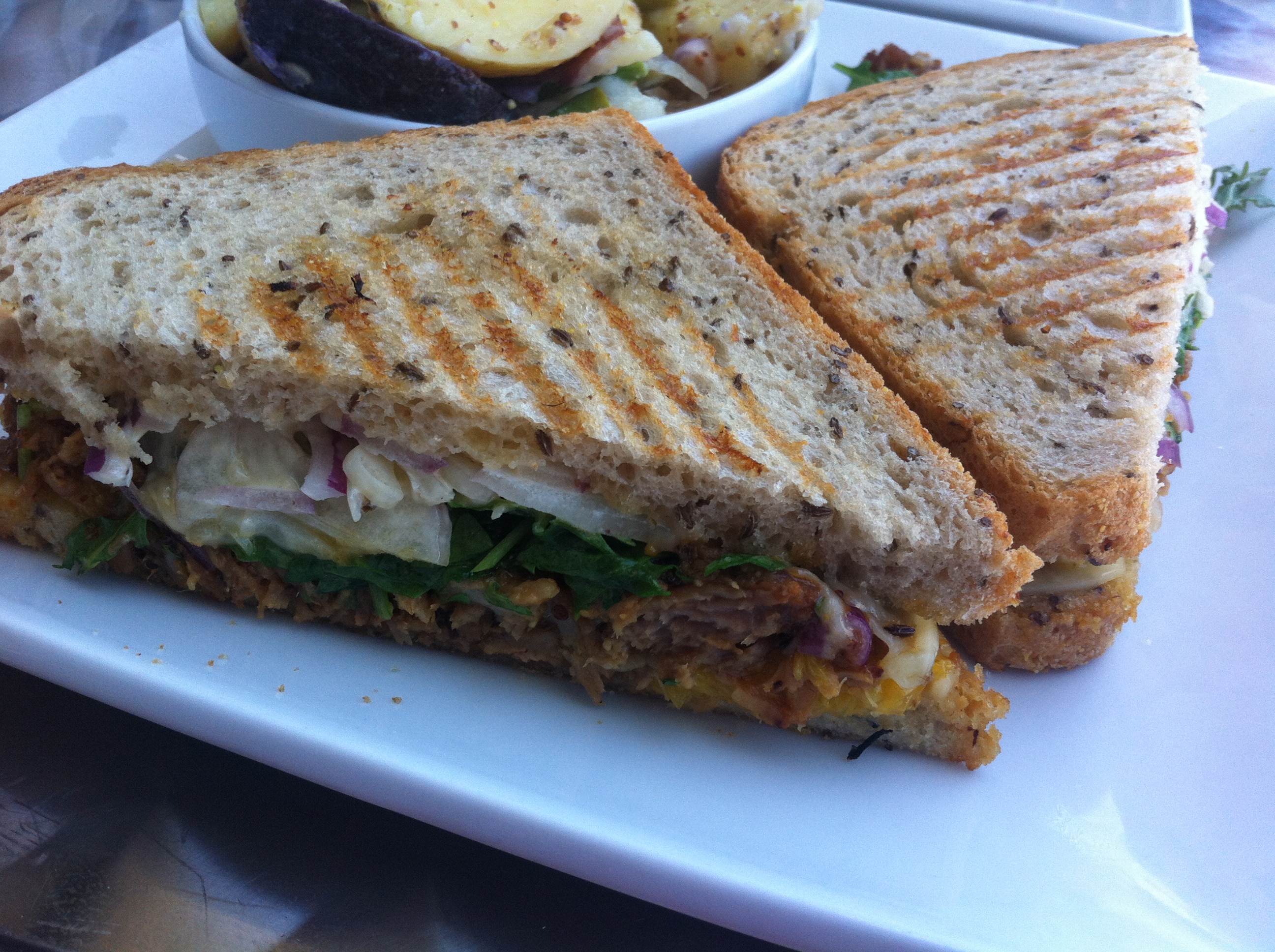 The sandwich — grilled chicken, butter leaf lettuce, avocado, tomato, and aioli — was fantastic. It was far better than the sum of its parts and its crowing achievement was the pretzel roll, enhancing everything contained therein. Even the inclusion of butter leaf over some of the more preeminent staples of sandwich lettuce was an inspired choice. As I had recently experienced at the Village Bakery and Cafe, the decision to slice the grilled chicken rather than present a complete, boring grilled chicken breast was once again the most correct decision that could have been made.