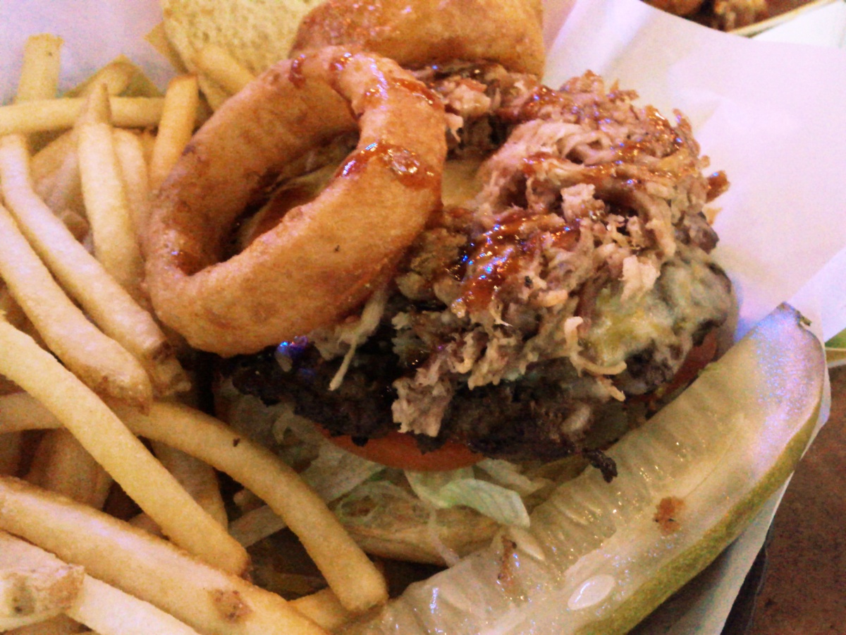 It’s been more than six months since the last installment of Slummin’ It, and that’s because I generally don’t go out of my way to eat terrible sandwiches. Sometimes I find myself in an establishment that promises 1600 calories full of burger (and fries?), a giant stupid pile of the usual lettuce/tomato/beef, plus a helping of pulled pork and some onion rings. I like big, stupid sandwiches in an abstract sense, and occasionally in real life. Buffalo Wild Wings is the kind of crap-on-the-walls establishment that should really excel at big, stupid sandwiches, so I was genuinely looking forward to what they could muster up.