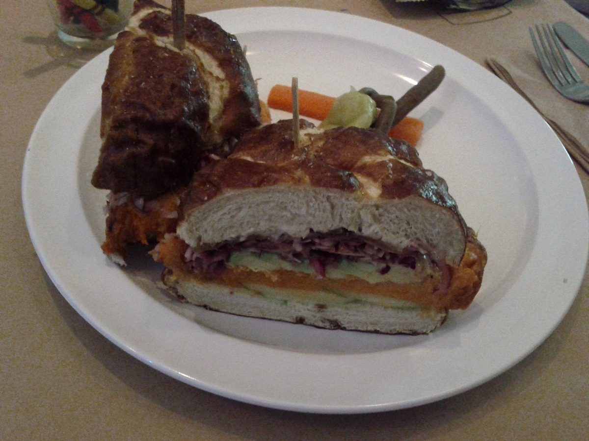 But enough about concept, sandwiches ultimately matter only in execution. With that in mind, this is a significantly smoother sandwich than it is on paper, but it’s far from perfect. The dominant notes in the flavor profile are the sweet potatoes, the cumin cole slaw, the avocados and the pretzel roll. That’s too bad about the roll, because it’s the breading that ultimately hamstrings the sandwich. With a fairly tough crust, the pretzel roll gave this sandwich an unacceptable level of filling creep, with large chunks of sweet potato diving from the sandwich to the plate. Sliced bread would have been my play here, something soft and yielding.