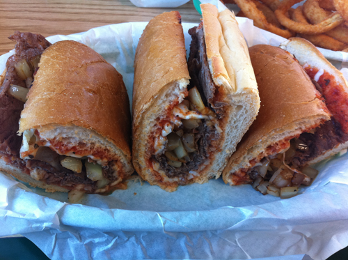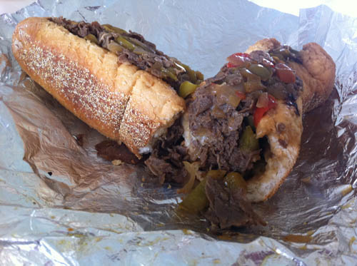 Grilled steak, arugula, and chimichurri sauce. There’s a bit of mayo on the bottom half of the roll, keeping it from getting soggy, but aside from that this is just steak and sauce. That’s a good thing, because steak and chimichurri is a phenomenal combination and there’s no need to fuss with it, just put the two together and let them sing. There wasn’t quite enough sauce here for my liking, and I think the sandwich would have been better served by spreading the sauce on the top half of the roll, rather than putting it directly on top of the steak, but outside of that this was still a darn good sandwich. The roll had a hearty crust, but not one so hearty that a bite sent things sliding all over or required a full pulling, head-twisting effort. I have a special place in my heart for the simple sandwich, and something like this could easily be duplicated at home by any interested enthusiast. I recommend you do so immediately; there’s a delicious sandwich just waiting for you.