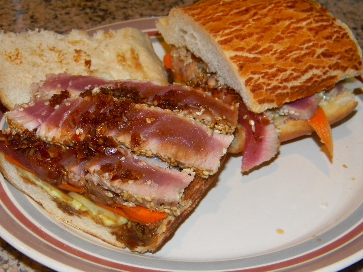 I don’t have it quite right. It’s a good sandwich, probably the best I’ve ever made, but it isn’t quite right. The preparation starts with slices of carrot, about a sixteenth of an inch thick. They go into a marinade of soy sauce, rice vinegar and water (in a 1-1-1 ratio), ginger, toasted garlic, red pepper flakes and a touch of honey. After a few hours in there they come out, and the marinade goes into a skillet to be cooked down. Similar slices of cucumber are prepared but left unadulterated. Wasabi mayo is prepared, with a strong emphasis on the wasabi. I’m no great fan of mayonnaise. In fact, my attitude might be best characterized as “tolerant.” It has its place, but if you use too much…well, I hope you’re right with the lord, because I’m not likely to forgive you. But I find it unobjectionable as a sort of neutral vehicle for another flavor, and it performed well here. The bread went into a 200 degree oven to really maximize the crisp, although I’m not really sure how much this adds to the final product. Anyhow, the tuna steak is coated on both sides with sesame seeds and black pepper, and it goes into a hot pan for a scant couple of minutes. Cooking tuna for a sandwich is no different than any other application, and as always it’s best to undershoot. After coming out of the pan the fish is cut into quarter inch slices, laid atop the carrots, and finally drizzled with the reduced marinade.