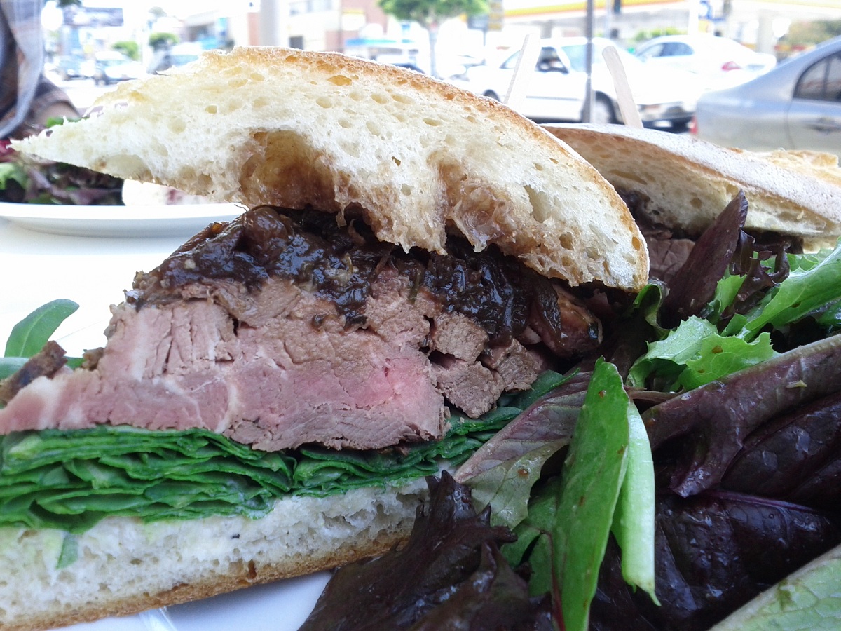 FOOD is a small cafe on Pico that prides itself on using the finest ingredients. I do love a highfalutin sandwich, so that sort of thing is right up my alley and I was not disappointed with the first offering from FOOD. The roasted beef tenderloin is specified as Meyer’s, meaning it’s free of antibiotics and hormones and raised humanely. That’s the kind of thing that’s tough to verify on the consumer’s end, but it sure tasted like it was raised with care. (I question any definition of “humanely” that ends in slaughter, but that’s a debate for another blog.) It was tender, flavorful beef, well paired in thick slices with arugula, horseradish cream and roasted garlic-onion jam. The slice width becomes important, because the sandwich comes on a baguette that has a powerful crust, as a decent baguette should. That necessitates some serious chewing, and thick slices of beef are the kind of thing required to stand up to that effort. There was a good amount of horseradish here, and though I complain (as always) that it could have used more, I will say that it’s probably just right for your average sandwich enthusiast. The onion jam is sweet, well contrasting the beef and the horseradish. This is a fine sandwich, put together with care and consideration with a delicious result.