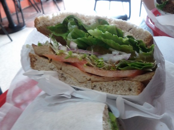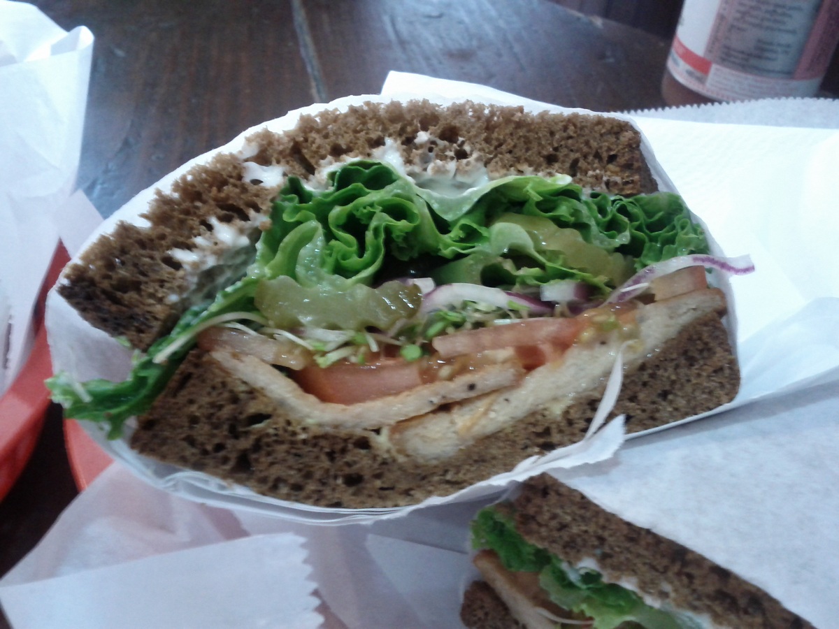 If we consider the most basic question, I should say that the sandwiches are a success. They taste good. The pepper steak was tasty, and the duck was particularly choice. It had a deep, smoky flavor, and the success of the sandwiches definitively credited to how good these flavors were. The accompanying ingredients were lettuce, tomato, pickles, red onions, mayo, mustard and, in owing to the location and the style of the place, sprouts. That’s a classic deli sandwich, but if the main ingredient fails there isn’t much there for backup. In further evidence of the reliance on the fake meat, if one is going to attempt to pass off a facsimile as hey-I-guess-it’s-good-enough, one does not attempt duck. It’s not a fake-it-and-hope-nobody-notices move. That’s important to note, because it points at the whole problem with the sandwich.