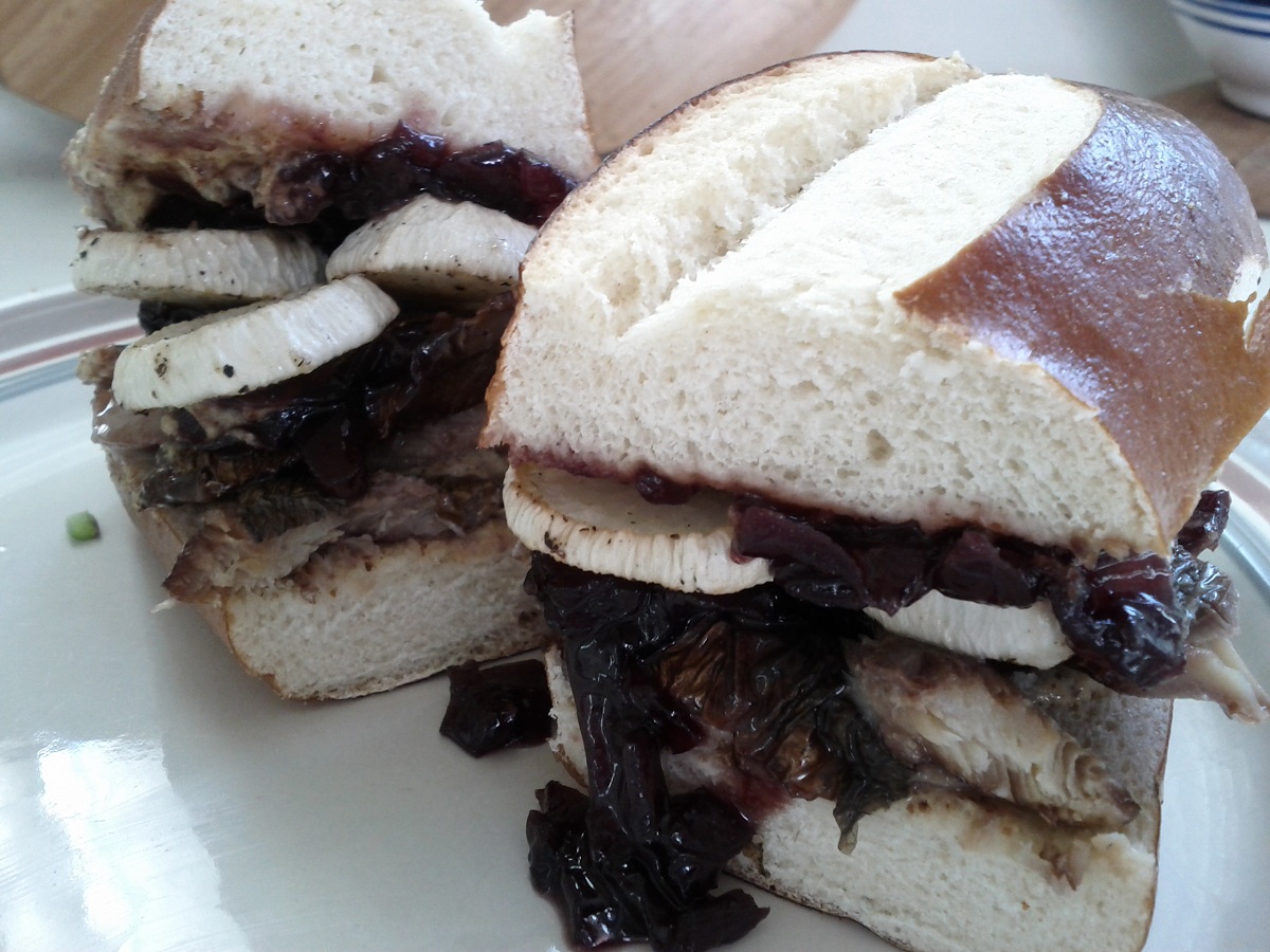 The turnip is a starch, of course, and that makes it a tricky thing to work with. There are some good sandwiches with fried potatoes in them, but in general adding such a thing throws off the starch-something else-starch balance that is the sandwich. So I figured if I was going to work with turnips, I had to include some rather large flavors to prevent a bland, starchy experience. That meant some smoked herring fillets, which have a heavy smoke, distinctly fishy flavor. So now I had the turnips, which bring a woody, earthy flavor, and smoky fish. I thought something sweet might play well in there, as smoke and sugar tend to pair exceedingly well, in barbecue and elsewhere. Caramelized onions are my go-to move for sweet on a sandwich, but I thought I might take it a step further for this occasion and I cooked up a batch of onion jam. Recipes vary, but in this case it was mostly a few pounds of onions cooked down in a couple cups of red wine and a honey gastrique. So the turnips, fish, and onion jam went down on some pretzel bread with a bit of horseradish mustard, and that was that.